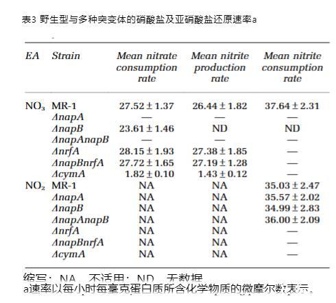 硝酸盐被完全消耗(图4a–c)。当使用硝酸盐时,除DnapB菌株外,所有napAt菌株的硝酸盐还原动力学和速率均相同(表3)。DnapB菌株的硝酸盐还原速率比其他napAt菌株慢约15%(图4a)。特别值得注意的是,DnapBDnrfA菌株的硝酸盐还原速率与野生型相当(图4a)。出乎意料的是,DnapB菌株与所有napA菌株均未检测到亚硝酸盐(图4b)。然而,铵离子在DnapB菌株中比野生型更早达到可检测水平,并最终积累至与野生型相同的浓度(图4c)。这一结果表明,DnapB菌株在生长早期较高的生物量可能源于其缺乏亚硝酸盐毒性。此外,野生型的亚硝酸盐还原速率高于硝酸盐。当使用亚硝酸盐时,除缺乏NrfA的菌株外,所有菌株的亚硝酸盐还原速率相同,包括DnapB菌株——当以硝酸盐作为唯一电子受体时,该菌株的亚硝酸盐还原速率无法评估(表3)(图4d)。