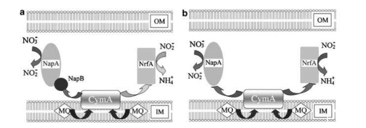 当NrfA不可用时,无论NapB是否存在,来自CymA的电子在NapA和NrfA之间的竞争都会崩溃。