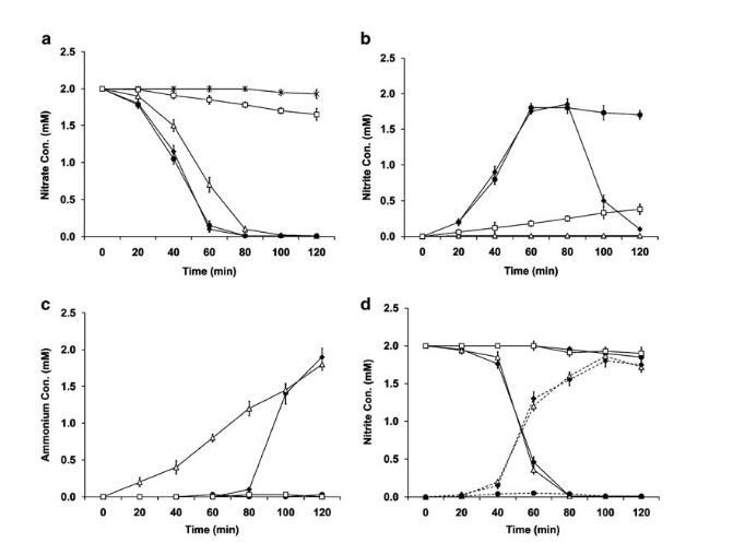该结果表明,亚硝酸盐向铵离子的转化速率高于硝酸盐向亚硝酸盐的转化速率,这解释了为何在使用硝酸盐时,DnapB培养物中亚硝酸盐浓度低于可检测水平。此外,对DcymA培养样本的IC分析证实,该菌株确实保留了还原硝酸盐的能力,尽管极其微弱,但完全无法还原亚硝酸盐(图4a-d)。