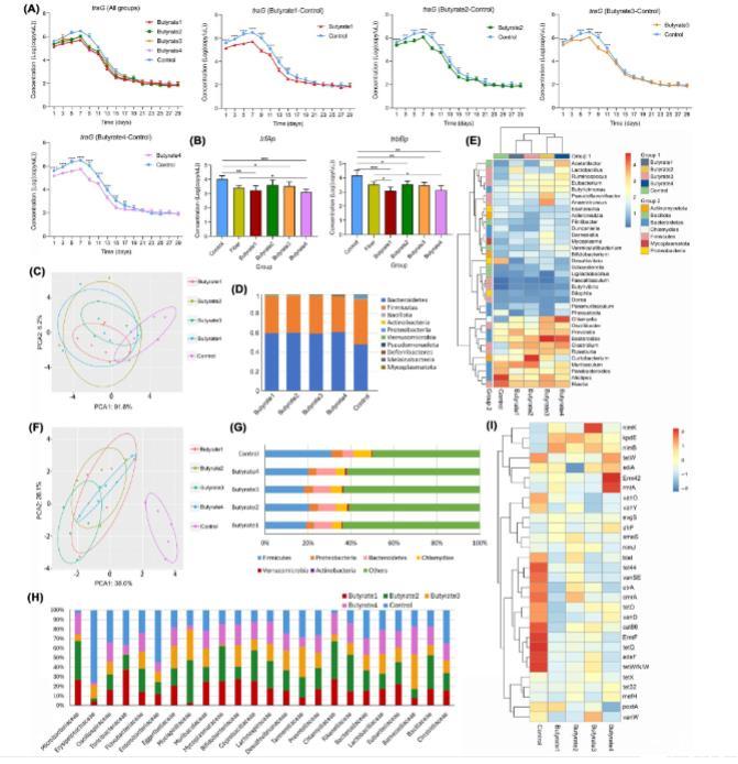 图3、SCFAs对小鼠肠道微生物群及ARGs宿主细菌的影响(n=5)。不同SCFAs作用下目标基因表达随时间的变化(A)。SCFAs作用下调控基因trfAp和trbBp的表达(B)。基于属水平的肠道微生物群PCA分析(C)。门水平和科水平前10个分类群相对丰度的柱状图(D)。各组属水平前35个分类群的热图(E)。基于属水平的肠道耐药组PCA分析(F)。门水平携带ARGs的宿主柱状图(G)。科水平携带ARGs的宿主柱状图(H)。每个耐药组中前30个ARGs的热图(I)。四种丁酸衍生物:Butyrate1,4-(4-甲氧基苯基)丁酸;Butyrate2,3-羟基-3-甲基丁酸;Butyrate3,4-羟基丁酸;Butyrate4,4-(4-氯苯基)丁酸。