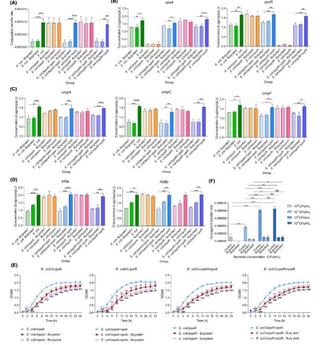 图5、SCFAs对敲除和回补菌株中接合相关基因表达的影响。敲除和回补菌株在两种丁酸中的接合转移率(A)。敲除和回补菌株在两种丁酸中的cpxA和cpxR基因表达水平(B)。敲除和回补菌株在两种丁酸中的外膜蛋白基因表达水平(C)。敲除和回补菌株在两种丁酸中的接合转移调控基因表达水平(D)。两种不同丁酸中敲除和回补菌株的生长曲线(E)。细菌细胞密度对接合效率的剂量依赖性影响(F)