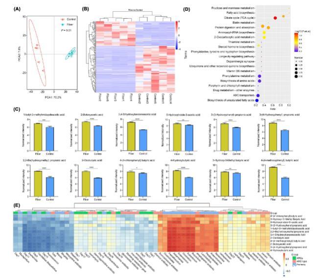 图2、高纤维饮食影响肠道代谢物。各组代谢物的PCA分析(A)。差异代谢物聚类的热图(B)。两组SCFAs的比较柱状图(C)。KEGG代谢通路富集气泡图(D)。ARGs数量、不同细菌数量、肠道耐药类型数量与SCFAs的相关性分析(E)。