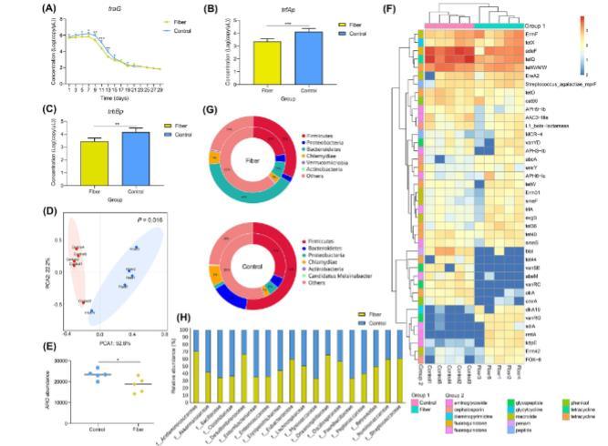 图1、高纤维饮食对小鼠肠道ARGs的影响。不同饮食下目标基因trdG随时间变化的表达水平(A)。质粒复制的调控基因trfAp(B)。由接合对形成的调控基因trbBp(C)。基于属水平的肠道耐药组PCA分析(D)。显示两组已知ARO数量的散点图(E)。每个耐药组中前40个ARGs的热图。右侧注:组1代表实验分组,组2代表耐药基因的耐药类型(F)。门水平肠道总细菌和ARGs宿主细菌分布的双圈图,外圈代表总肠道微生物群,内圈代表携带ARGs的宿主细菌(G)。家族水平携带ARGs的宿主柱状图(H)。