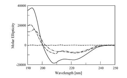 图3-BPC8L和BPC8D在pH 7.4的10 mM磷酸钠缓冲液中不同TFE浓度下的CD光谱。BPC8L在0%TFE中(---);BPC8L在50%TFE中(----);BPC8L在100%TFE中(-);BPC8D在100%TFE中(---)。
