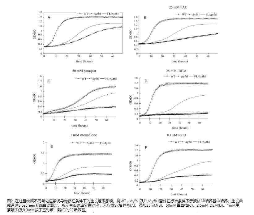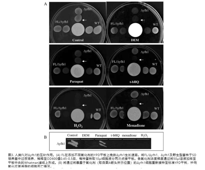 接下来我们检查FL是否也能提高Δyfh1背景菌株耐受氧化剂的能力。在存在50 mM百草枯、2.5 mM马来酸二乙酯(DEM)、1 mM甲萘醌和300μM叔丁基氢醌(t-bHQ)的情况下测量细胞生长。如图2C-F所示,Δyfh1菌株对各种氧化剂过敏。然而,FL转化子显示出对氧化应激的更大耐受性和改善的生长,尽管后者未达到野生型的水平。
