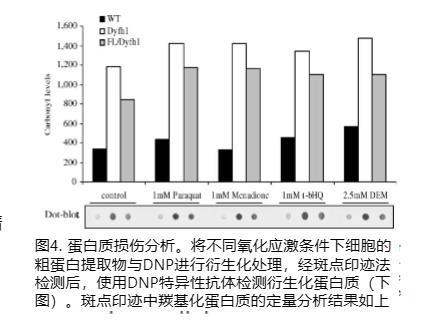 众所周知,大多数氧化剂会引起细胞蛋白质的氧化修饰。因此,我们使用点印迹分析比较了Δyfh1、WT和FL/Δyfh1中的蛋白质羰基化。图4描述了一个代表性的点印迹模式示例,该模式使用抗DNP抗体检测羰基化蛋白质。在标准或氧化应激生长条件下,缺陷型frataxin菌株显示羰基化蛋白质总量比其WT显著增加2.6-4.3倍。有趣的是,在相同的生长条件下,FL明显降低了Δyfh1菌株中羰基化蛋白质的总量,降低了17-28%。