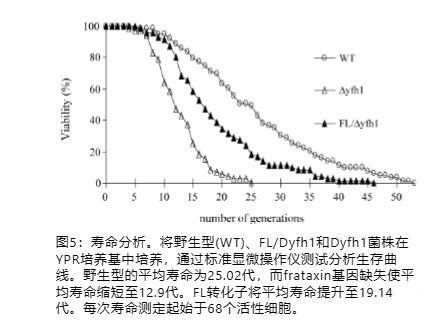 一个普遍的观察结果是氧化损伤导致衰老。酵母衰老的经典研究基于复制寿命的测量,通常通过计算母细胞在衰老前经历的分裂次数来衡量。由于frataxin突变酵母积累氧化应激,因此我们推断frataxin失活可能降低酵母的寿命,如果是这样,人铁蛋白L是否可以修复这种缺陷。为了测试这种可能性,我们在Δyfh1、其亲本菌株WT和铁蛋白转化子FL/Δyfh1中进行了寿命分析。在固体YPR培养基上进行通过显微操作的复制寿命测定,因为Δyfh1菌株在合成固体培养基上几乎不生长(数据未显示)。如图5所示,Δyfh1的复制寿命平均比WT短49%,表明frataxin确实参与酵母的寿命。有趣的是,在Δyfh1背景中转化人铁蛋白L可以挽救细胞免于死亡,并且FL/Δyfh1的寿命达到了其WT值的76.5%。
