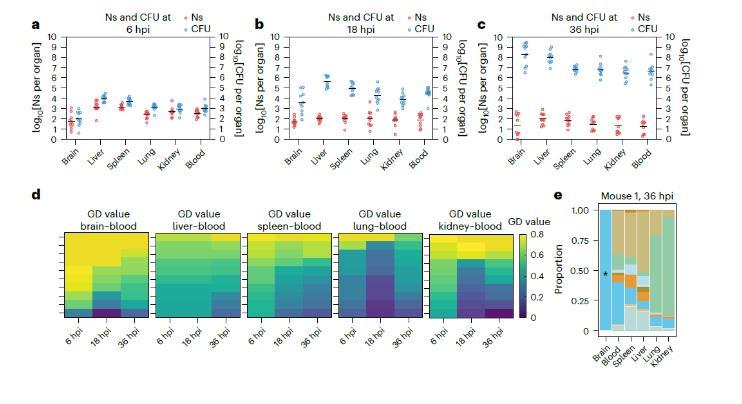 图2、使用条形码细菌分析兽疫链球菌感染动力学。a-c)尾静脉注射5×10^6 CFU SEZ STAMP。(条形码库)后,在6 hpi(a)、18 hpi(b)和36 hpi(c)从器官回收的log10(CFU)和log10(Ns)(n=10)。用戊巴比妥麻醉后,对所有小鼠进行心脏灌注以确保血液与其他器官的清晰区分。d)GD(遗传距离)热图显示6 hpi、18 hpi和36 hpi时血液和各器官中的GD。每个方格代表一只小鼠。脑和血液中较高的GD值表明细菌种群与其他器官和血液相比相似性较低。每个时间点包含10只小鼠的数据。e)36 hpi时小鼠1的条形码频率分布。每种颜色的比例表示各器官内条形码的相对丰度。每种颜色代表一个条形码占该器官总条形码的百分比。星号指示脑中主要富集的条形码,与血液中的不同。