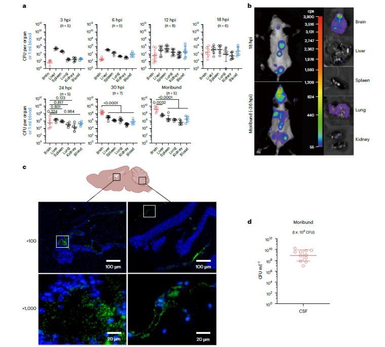 图1、兽疫链球菌在脑脊液中大量繁殖,并在大脑中达到较高的菌落形成单位(CFU)水平。a,尾静脉注射5×106个CFU的S.zooepidemicus后,随着时间的推移,各器官的CFU负荷情况(几何平均值±几何标准差;单因素方差分析后进行对数转换后的CFU多重比较检验)。小鼠在29至39小时感染后出现生命垂危症状。b,C57BL/6J小鼠经静脉注射5×106个CFU的SEZluc。左图:在18小时感染后进行的体内生物发光成像显示S.zooepidemicus存在于濒死小鼠的大脑中,并且细菌在大脑中积累。中间图:生物发光信号的定量(每秒计数(cps))。右图:濒死小鼠死后器官的生物发光。c,d,C57BL/6J小鼠经静脉注射106个CFU的S.zooepidemicus,然后在濒死阶段收集大脑和脑脊液用于组织免疫荧光或CFU计数。c,鼠脑的矢状面免疫荧光。细菌用抗-SzM单克隆抗体标记(绿色),细胞核用DAPI染色(蓝色)。最终的译文:这个黑色方块分别表示第三脑室(左)和脑裂(右)。d、濒死小鼠脑脊液中的CFU负荷。