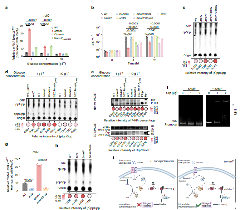 SDS-PAGE(十二烷基硫酸钠聚丙烯酰胺凝胶电泳)用于分离Crp和GroEL。Native PAGE用于以天然构象分离HPr和P-HPr。f.EMSA评估relQ启动子与Crp或Crp:cAMP复合物的结合。g.WT、Δcrp、ΔmanY和ΔmanYΔcrp菌株中relQ相对转录水平,通过qRT-PCR检测(n=3)。数据归一化到recA。h.兽疫链球菌WT、Δcrp、ΔmanY和ΔmanYΔcrp菌株细胞内(p)ppGpp水平,通过核苷酸提取后TLC检测。细菌在CDM中1 g/L葡萄糖下生长。i.示意图模型说明PTS系统与严谨反应之间的通路。在低葡萄糖条件下,兽疫链球菌通过PTSman运输葡萄糖,导致HPr磷酸化。高P-HPr比率与Crp表达降低相关,从而抑制cAMP::Crp复合物激活relQ,防止(p)ppGpp积累和严谨反应启动。