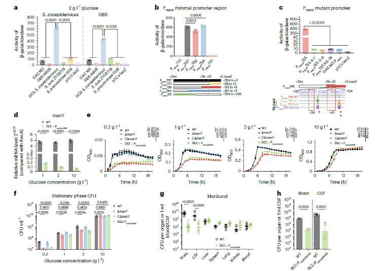 图4、PTSman启动子赋予兽疫链球菌在低葡萄糖中的生长优势。a-c.启动子活性评估。a.来自不同链球菌的PmanX克隆到pTCV-lacZ中,并导入WT兽疫链球菌或GBSA909中以评估转录活性(n=3)。S.suis指猪链球菌,S.pneumoniae指肺炎链球菌。b.将manX上游截断区域克隆到pTCV-lacZ中以识别潜在启动子(n=3)。图示截断区域,条形图颜色与图示匹配。c.GAS和GCS的PmanX中-152至-104区域核苷酸比对显示两个核苷酸突变(n=6)。d.WT和SEZ::PmanX(A909)菌株中相对manY转录水平,通过qRT-PCR检测并归一化到recA(n=3)。e.WT、ΔmanY、CΔmanY和SEZ::P manX(A909)。
