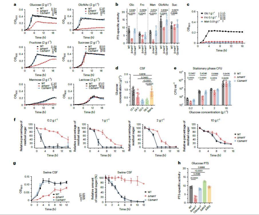 e.WT、ΔmanY和CΔmanY在稳定期(培养12小时)在CDM中不同葡萄糖浓度(0.2 g/L、1 g/L、2 g/L和10 g/L)下的CFU(n=6)。f.接种WT、ΔmanY和CΔmanY后,CDM中残留葡萄糖的相对百分比(n=3)。残留葡萄糖相对百分比通过特定时间CDM中剩余葡萄糖浓度除以初始葡萄糖浓度(0小时)计算。g.左图:WT、ΔmanY和CΔmanY在猪CSF中体外培养的生长曲线(n=3)。右图:接种WT、ΔmanY和CΔmanY后猪CSF中残留葡萄糖的相对百分比(n=3)。h.WT和指示突变株在葡萄糖中的PTS特异性活性(n=5)。