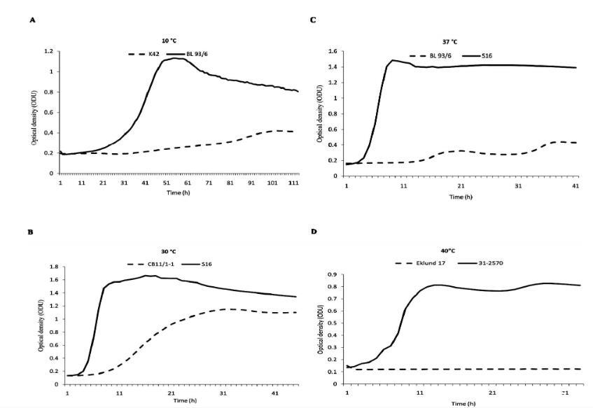 图2: 在10°C(A)、30°C(B)、37°C(C)和40°C(D)下生长差异最大的II组肉毒梭菌菌株的生长曲线。虚线表示最大生长速率最低的菌株,实线表示最大生长速率最高的菌株。光密度在600纳米波长下测量(以光密度单位[ODU]表示)。