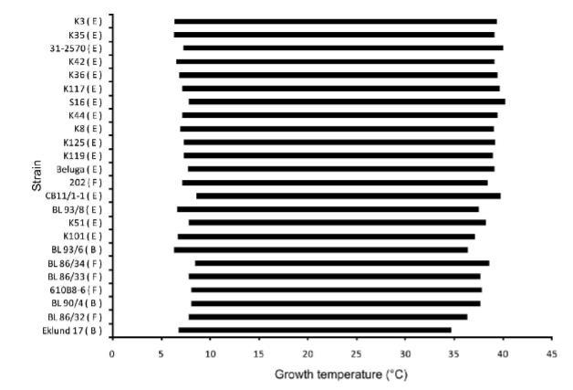 生长速率与生长温度界限之间的关系。观察到最高生长温度与37°C最大生长速率之间存在高度相关性。仅就B型菌株而言,相关性高于其他菌株。最低生长温度与10°C最大生长速率之间的关联不太明确。
