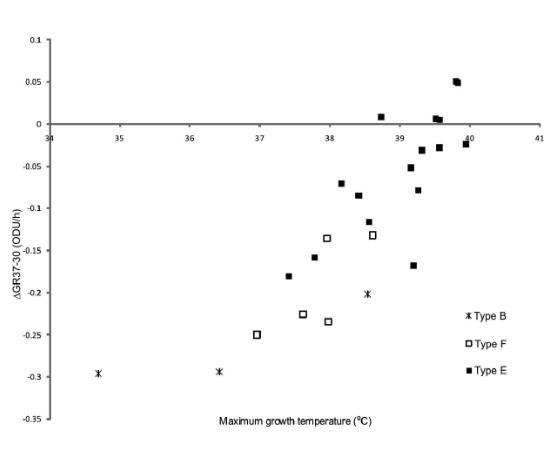 发现所有菌株的最高生长温度与△GR37-30之间存在显著相关性。当单独考虑B型菌株时,观察到最高的相关性。E型和F型菌株的相关性分别为0.75和0.76。五株在37°C最大生长速率高于30°C的E型菌株,其平均最高生长温度也高于所有菌株或所有E型菌株的平均值。19株具有负△GR37-30值的菌株中,有10株的最高生长温度低于平均值,而其余9株的最高生长温度高于平均值。这9株菌包括7株E型、1株B型和1株F型。