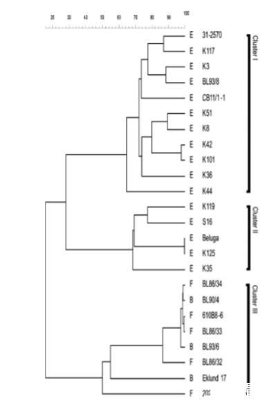 生长与AFLP簇之间的关系。在AFLP分析中,II组肉毒梭菌菌株形成三个簇。E型菌株分为两个簇,B型和F型菌株聚集在一起。除了上述毒素类型之间的生长差异外,簇II菌株在10°C的最大生长速率约为簇I菌株的两倍。遗传背景在24株菌株不同温度下的生长特性中反映较差。代表相同AFLP簇的个体菌株存在相当大的生长差异。