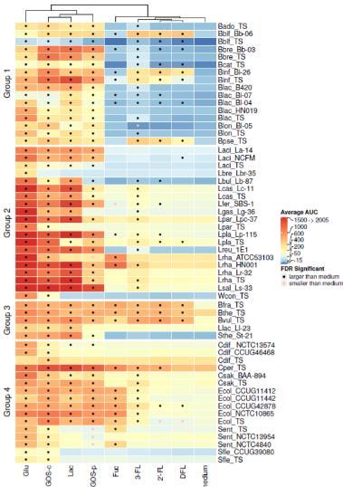 图1. 使用不同碳源及未添加碳源培养基的细菌生长情况。细菌生长通过生长曲线下面积(AUC)进行测量,培养基分别含有1%葡萄糖(Glu)、商业低聚半乳糖(GOS-c)、乳糖(Lac)、纯化富集低聚糖GOS(GOS-p)、岩藻糖(Fuc)、3-岩藻糖基乳糖(3-FL)、2'-岩藻糖基乳糖(2'-FL)或二岩藻糖基乳糖(DFL)。菌株按(1)双歧杆菌属(2)乳杆菌科(3)其他人类共生菌(4)潜在致病菌进行分组,各组内菌株按缩写字母顺序排列(缩写列表参见表2)。AUC值采用颜色编码:深红色>AUC>1500;橙红色AUC 1000-1500;橙色AUC 600-999;浅橙色AUC 400-599;黄色AUC 200-399;浅蓝色AUC 50-199;深蓝色AUC 15-49,便于培养基与碳源之间的比较。经FDR校正的显著性t检验结果(与对应培养基相比)通过对应AUC单元格内的圆点标示。