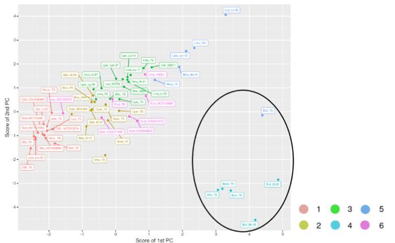为了可视化所有研究的57种细菌的聚类,对所有处理的相关矩阵进行了主成分分析(图5)。提取了前四个主成分,它们解释了数据中95%的方差。基于提取的主成分将菌株聚类为六个簇。