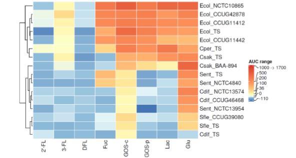 图4. 碳源对潜在致病菌生长的影响。通过生长曲线下面积(AUC)评估添加1% 2'-岩藻糖基乳糖(2'-FL)、3-岩藻糖基乳糖(3-FL)、二岩藻糖基乳糖(DFL)、岩藻糖(Fuc)、商业低聚半乳糖(GOS-c)、富集低聚糖的GOS(GOS-p)、乳糖(Lac)和葡萄糖(Glu)后潜在致病菌的生长情况。AUC值通过减去未添加碳水化合物的生长培养基中细菌的AUC值进行标准化。生长数据采用色标标注:深红色代表强烈生长(AUC值范围:1000-1700;500-999;200-499;100-199;36-99;0-35),深蓝色代表生长低于培养基基准(AUC值范围:-110至-1)。细菌菌株缩写见表2。