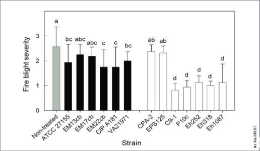 图2. 成团泛菌临床菌株(黑色柱)与植物益生菌株(白色柱)对梨火疫病的生物防治效果。数据为八个花朵三次重复的平均值。误差线表示均值的95%置信区间。根据Waller-Duncan检验,标有相同字母的火疫病严重程度柱状图差异不显著(P<0.05)。