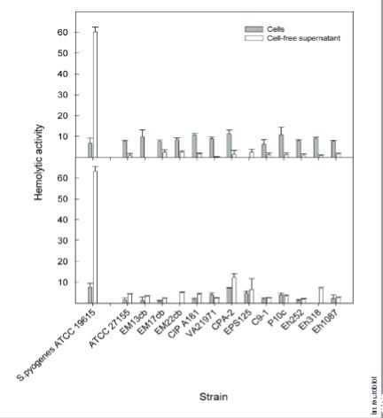 与化脓性链球菌ATCC 19915阳性对照相比,在液体或琼脂培养中进行的红细胞测定中,没有任何植物有益或临床泛菌属菌株具有显著的溶血活性。在血琼脂上,观察到透明晕圈,并且在液体测定中,使用绵羊血和马血时,上清液的溶血百分比约为蜂毒肽溶血的60-65%(图5)。