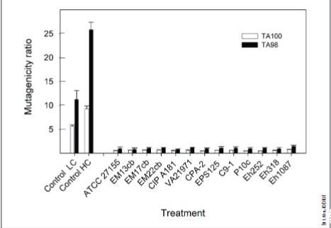 图6. Pantoea菌株无细胞培养上清液的遗传毒性(艾姆斯试验)与诱变剂对比。采用沙门氏菌突变株TA100和TA98作为指示菌株。使用1.25(LC)和2.5(HC)μM的叠氮化钠作为TA100菌株的诱变剂,2.5(LC)和5.0(HC)μM的2-硝基芴作为TA98菌株的诱变剂。