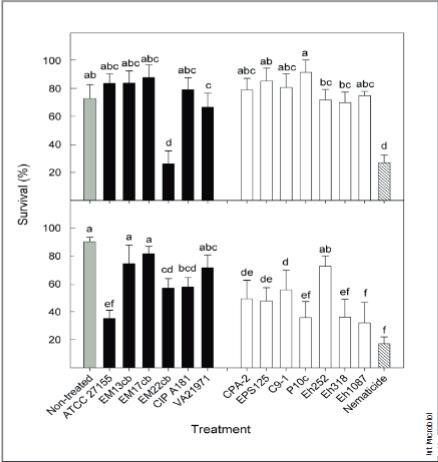 图3. 临床菌株(黑色柱)和植物益生菌株(白色柱)的Pantoea菌细胞(上图)及无细胞培养上清液(下图)对植物寄生线虫Meloidogyne javanica(J2阶段幼虫)存活率的影响,与化学杀线虫剂Vydate P(虚线柱)的对比。误差线表示均值的95%置信区间。根据Waller-Duncan检验,标有相同字母的存活率柱状图无显著差异(P<0.05)。