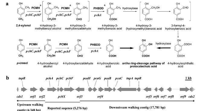 图1 a 恶臭假单胞菌NCIMB 9866中2,4-二甲酚和对甲酚的推定代谢途径(Chapman和Hopper 1968;Cronin等1999;El-Mansi和Hopper 1990;Elmorsi和Hopper 1977;Kim等1994),以及本研究提出的由pchC和pchF编码的PCMH及pchA编码的对羟基苯甲醛脱氢酶(PHBDD)催化的代谢反应(标有星号)。b 通过从已报道基因双向基因组步移获得的基因簇结构