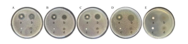 A:大肠杆菌;B:金黄色葡萄球菌;C:沙门氏菌;D:铜绿假单胞菌;E:单核细胞增生李斯特菌;a:菌悬液;b:无细胞上清液;c:菌体沉淀;d:MRS肉汤。