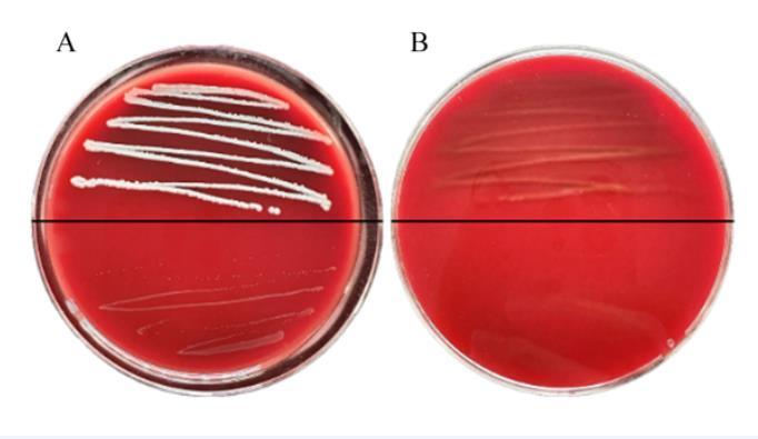 如图5-A所示,阳性对照的金黄色葡萄球菌表现出β-溶血;如图5-B所示,CLP51表现为γ-溶血(无溶血环),可初步判断CLP51安全,无溶血性。