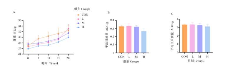 试验期间未有小鼠死亡,临床观察所有小鼠精神状况良好,摄食、饮水、粪便形态均正常。试验结束后剖检观察其内脏色泽、质地、体积等均未见病变,说明CLP51对小鼠临床应用无毒副作用。如图6所示,各组之间小鼠体重、平均日增重和平均日采食量均无显著差异(P>0.05)。