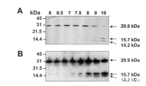 图4. 纯化HdiR的自切割分析。A. 含有500 ng纯化HdiR的自切割反应在SDS-PAGE凝胶上考马斯亮蓝染色后的可视化。B. 含有100 ng HdiR的自切割反应用抗His6-HdiR抗体进行Western印迹分析。具有计算分子量的HdiR衍生肽用右侧箭头指示。
