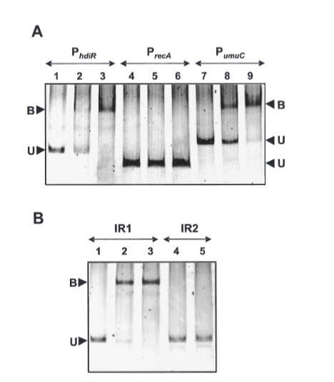 图3. HdiR与hdiR、recA和umuC启动子区域的结合。A. His6-HdiR与MG1363 hdiR、IL1403 recA和IL1403 umuC假定启动子区域的结合。反应含有35 ng源自hdiR、recA和umuC的PCR DNA片段,分别与0 ng、14 ng或28 ng HdiR混合。B. His6-HdiR与含有IR1或IR2的pBluescript-II SK+多克隆位点的结合。反应含有35 ng源自pBluescript-IR1和pBluescript-IR2的PCR DNA片段,分别与0 ng、14 ng或28 ng HdiR混合。反应在5% PAGE中分离,然后用EtBr染色凝胶并用Fluor-S成像仪扫描。未结合DNA和蛋白质-DNA复合物的位置如图所示。