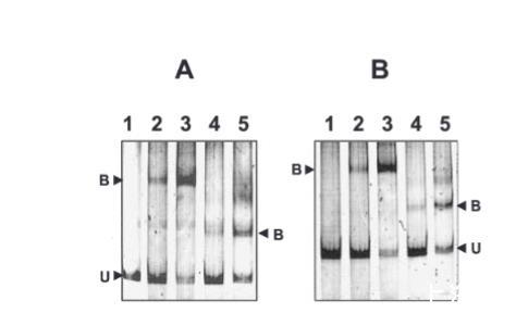 图6. 自切割HdiR的DNA结合能力。A. 含有hdiR启动子片段和分别在pH 7.0和pH 10孵育的His6-HdiR的反应。B. 含有umuC启动子片段和分别在pH 7.0和pH 10孵育的His6-HdiR的反应。第1道指不含His6-HdiR孵育的启动子片段。未结合DNA和蛋白质-DNA复合物的位置如图所示。