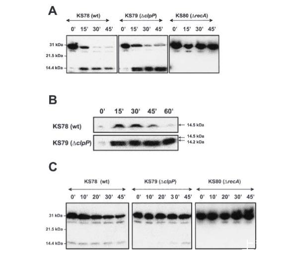 接下来,我们研究了ClpP对热激后HdiR稳定性的影响,发现虽然HdiR的量在野生型细胞中减少,但在缺乏ClpP的细胞中没有检测到显著变化。此外,在野生型细胞的所有时间点都可以检测到14 kDa的微弱条带,而在clpP突变株中,只有在添加CAM后45分钟取样的样品中才能检测到。