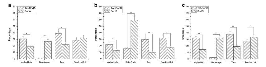 图 8 通过圆二色性对Tat标签蛋白和无Tat标签蛋白进行二级结构测定。(a) 通过CD对Tat-SodA和SodA进行二级结构测定。(b) 通过CD对Tat-SodB和SodB进行二级结构测定。(c) 通过CD对Tat-SodC和SodC进行二级结构测定。星号表示蛋白质间的α-螺旋、转角、β-折叠和无规卷曲含量具有统计学显著差异 (*P<0.05; **P<0.01)。