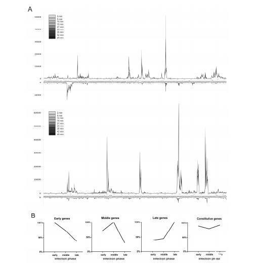 可以通过总结每个样本中比对到噬菌体基因组任一条链上每250 bp的读数,通过总计数(TC)将每个样本中比对到噬菌体的读数彼此归一化,并分别绘制每条链,来可视化感染过程中每个测量点的噬菌体转录(图3A)。这个图谱显示,在早期、中期和晚期阶段,基因转录模式总体稳定。大多数分析的基因在所有研究的时间点都呈现出相当相似的表达模式。只有少数选定的基因在比较感染早期和晚期时显示出表达的明显差异。对单个基因的早期(2-5分钟)、中期(10-21分钟)和晚期(28-49分钟)阶段的平均读数计数的比较表明了四种不同的基因表达模式(图3B)。