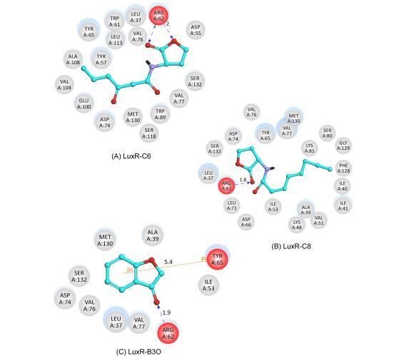 图5. C6(A)、C8(B)及B3O(C)与LuxR蛋白对接时的配体相互作用示意图。蓝色虚线与黄色实线分别表示配体与氨基酸残基之间的氢键及π-π键。