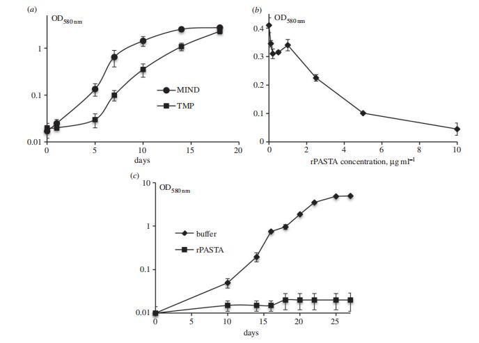 图6. PknB_PASTA抑制结核分枝杆菌生长。(a) PknB_PASTA结构域过表达延迟生长启动。将分枝杆菌(约1×10⁶个细胞/毫升)接种于含潮霉素和四环素的补充7H9培养基中。(b) 不同浓度rPASTA对结核分枝杆菌生长的影响。将分枝杆菌(10³个细胞/毫升)接种于含不同浓度无菌rPASTA的补充7H9培养基中,培养21天后测定光密度值。(c) 添加rPASTA延缓储存结核分枝杆菌的再生长。将结核分枝杆菌(2×10⁴个细胞/毫升)接种于补充7H9培养基中,以缓冲液作为对照组,rPASTA终浓度为10 mg/ml。(b,c) 数据点为3次生物学重复的平均值,误差线表示标准偏差。实验重复三次,图中展示典型实验结果。