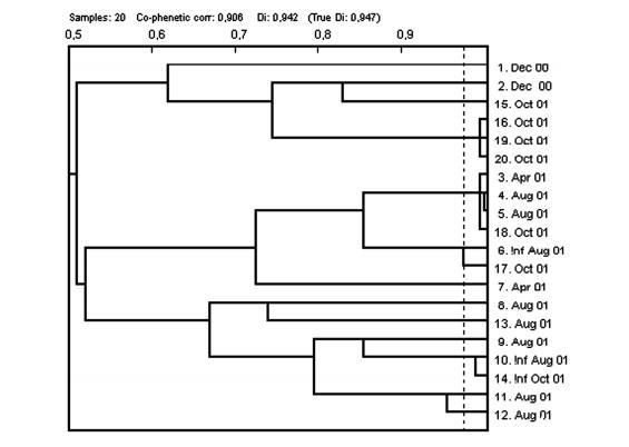 图2. 样本日期时环丙沙星耐药性粪便肠球菌PhP分型所得树状图。