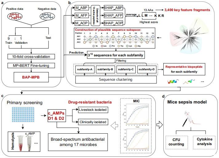 图1 、研究工作流程示意图。a首先利用前期研究中的生物活性肽数据集开展模型构建。通过对预训练的MP-BERT模型进行微调,开发了三种模型,分别为ABP-MPB、AFP-MPB和AOP-MPB,统称为BAP-MPB(基于MP-BERT的生物活性肽模型)。此外这三种模型被用于预测具有潜在三重活性的肽。b随后,基于对这三种模型的SHAP解释,采用13个氨基酸的滑动窗口,在被三种模型均预测为生物活性阳性的每条肽序列中,识别出平均SHAP值最高的关键特征片段。依据不同的氨基酸特征,这些关键特征片段被划分为四个亚家族,并且将每个位置上排名前三的高频氨基酸进行系统组合,形成所有可能的序列组合,以构建合理序列子空间。从每个合理序列子空间中选取代表性序列作为候选抗菌肽,用于化学合成。c、d针对小鼠脓毒症模型开展进一步的功效测试与机制分析。最低抑菌浓度实验设置三次生物学重复,数据以平均值±标准差表示,同时开展兼具体外抗菌和抗氧化活性的体内实验。