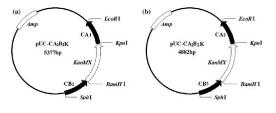 本研究中使用的PCR引物均根据酿酒酵母S288c基因组序列(NCBI,http://www.ncbi.nlm.nih.gov/)设计,并列于表2。pUC19用作骨架构建重组质粒pUC-CA1B1K和pUC-CA2B2K。由于葡萄酒酵母细胞是二倍体,构建了两种重组质粒以删除CAR1基因的两个拷贝。第一个质粒pUC-CA1B1K的构建如下:用CA1-up和CA1-down引物扩增的CAR1基因上游同源片段(命名为CA1)的EcoRI和KpnI位点,克隆到pUC19克隆载体中,得到pUC-CA1质粒。用CB1-up和CB1-down引物以WY1基因组DNA为模板,通过PCR扩增CAR1的BamHI和SphI下游同源片段(命名为CB1),插入pUC-CA1的BamHI和SphI位点,得到名为pUC-CA1B1的质粒。然后,利用Kan-up和Kan-down引物从pUG6载体扩增用作G418抗性标记的KanMX标记基因序列。将KanMX标记基因序列亚克隆到pUC-CA1B1的KpnI/BamHI位点,获得名为pUC-CA1B1K的质粒(图1a)。缺失质粒pUC-CA2B2K的构建方法类似,但PCR产生的CA2和CB2片段分别与CAR1基因的上游和下游区域同源,比CA1和CB1片段更靠近CAR1基因,且分别与CA1和CB1片段不重叠(图1b)。