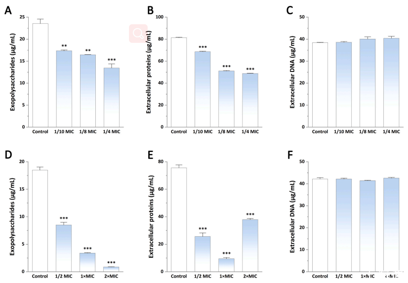 图3、PLA对单核细胞增生李斯特菌10403S生物膜基质中EPS含量的影响。将生物膜在PLA(分别为1/10MIC、1/8MIC和1/4MIC)存在下孵育48小时,然后将生物膜中(A)胞外多糖、(B)细胞外蛋白和(C)细胞外DNA的量被确定了。在暴露于PLA(分别为1/2MIC、1×MIC和2×MIC)4小时后,对成熟生物膜中(D)胞外多糖、(E)胞外蛋白和(F)胞外DNA的含量进行定量。