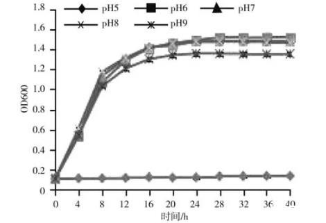 不同初始的pH条件下,FCX2菌株生长趋势相同,即菌液均在8 h后达到最大OD值,但不同条件下的最大OD值并不相同,其中该菌最适的pH为8。图1的结果同样说明FCX2菌株在供试pH6-9范围内该菌均可达到最大产量,而在pH5的初始状态下,FCX2菌株培养液OD几乎不变,菌体生长接近停止,说明菌体无论是在产量还是在生长速率上均较低,可能是因为初始的酸性环境对菌体生长产生了抑制作用。
