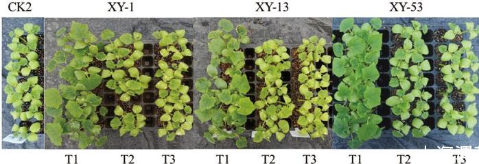注: CK2、T1、T2、T3是不同的处理方式,CK2、T1、T2、T3分别代表黄瓜幼苗分别接种了清水、XY-1、XY-13、XY-53