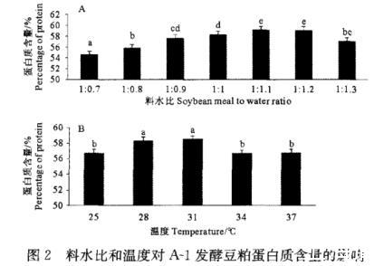 研究结果表明料水比显著影响A-1发酵豆粕性能(P<0.05)。料水比从1∶0.7到1∶1.3,A-1先提高发酵豆粕蛋白质含量后降低其含量。料水比1∶1.1时,发酵性能最好,发酵豆粕蛋白含量最高(见图2)。因此,料水比1∶1.1最佳。最佳料水比时,温度显著性影响A-1豆粕发酵性能P<0.05)。从25~37℃,A-1先显著提高豆粕蛋白质含量,然后降低。28和31℃时,发酵性能最好,显著提高豆粕蛋白含量(P<0.05)。31比28℃更显著缩短发酵时间。因此,31℃为最佳发酵时间。