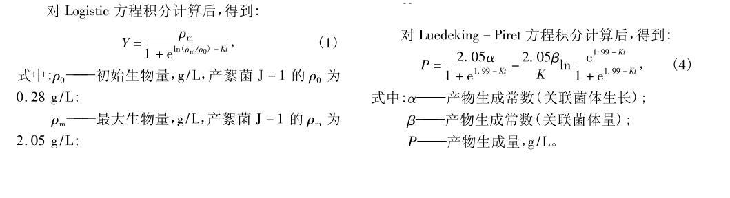 当α≠0、β=0时,发酵类型属于生长偶联型;α=0、β≠0时,发酵类型属于非生长偶联型;α≠0、β≠0时,发酵类型属于部分生长偶联型。由式(6)可见,当α值越大,β值越小时,产物生成量越高。再次证明了产絮菌J-1发酵微生物絮凝剂的过程为部分偶联型。